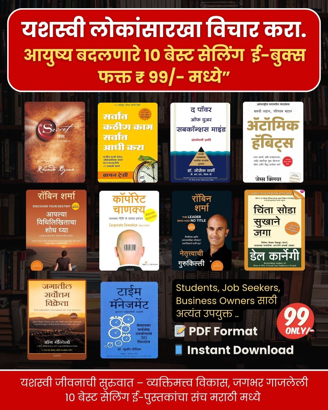 ₹99 मध्ये उपलब्ध असलेला हा 10 मराठी Personality Development eBooks Bundle तुमचा आत्मविश्वास, सवयी, विचारशक्ती आणि वेळेचं नियोजन सुधारण्यासाठी उपयुक्त आहे. जगप्रसिद्ध बेस्ट सेलिंग पुस्तकांवर आधारित हा संच सोप्या मराठी भाषेत आहे. हि Instant Download PDF eBooks असून मोबाइल किंवा लॅपटॉपवर सहज वाचता येतात.  तर आजच स्वतःमध्ये गुंतवणूक करा आणि यशाच्या दिशेने पहिलं पाऊल टाका.